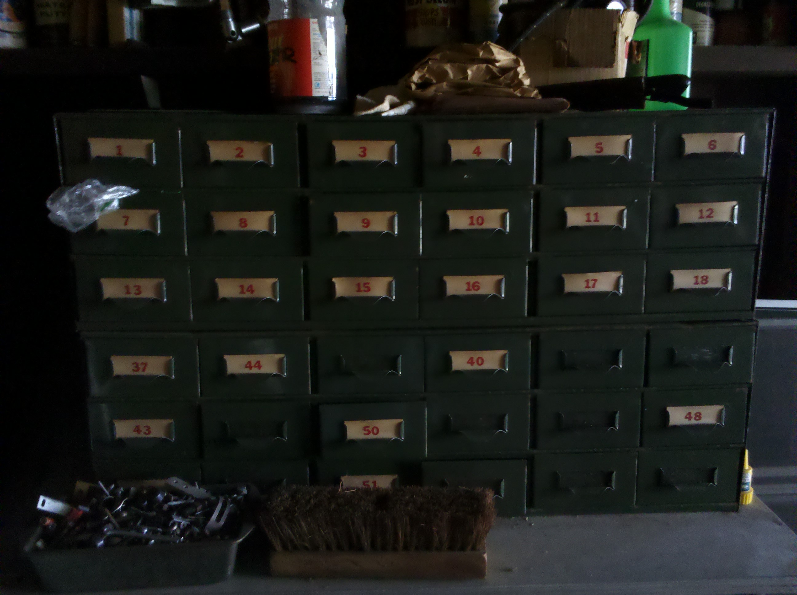 This drawer unit was probably tossed out by his office building when he was working there. Rather than let it go to some dumpster or removal service, he found service for it in the garage (for about 30 years at that):