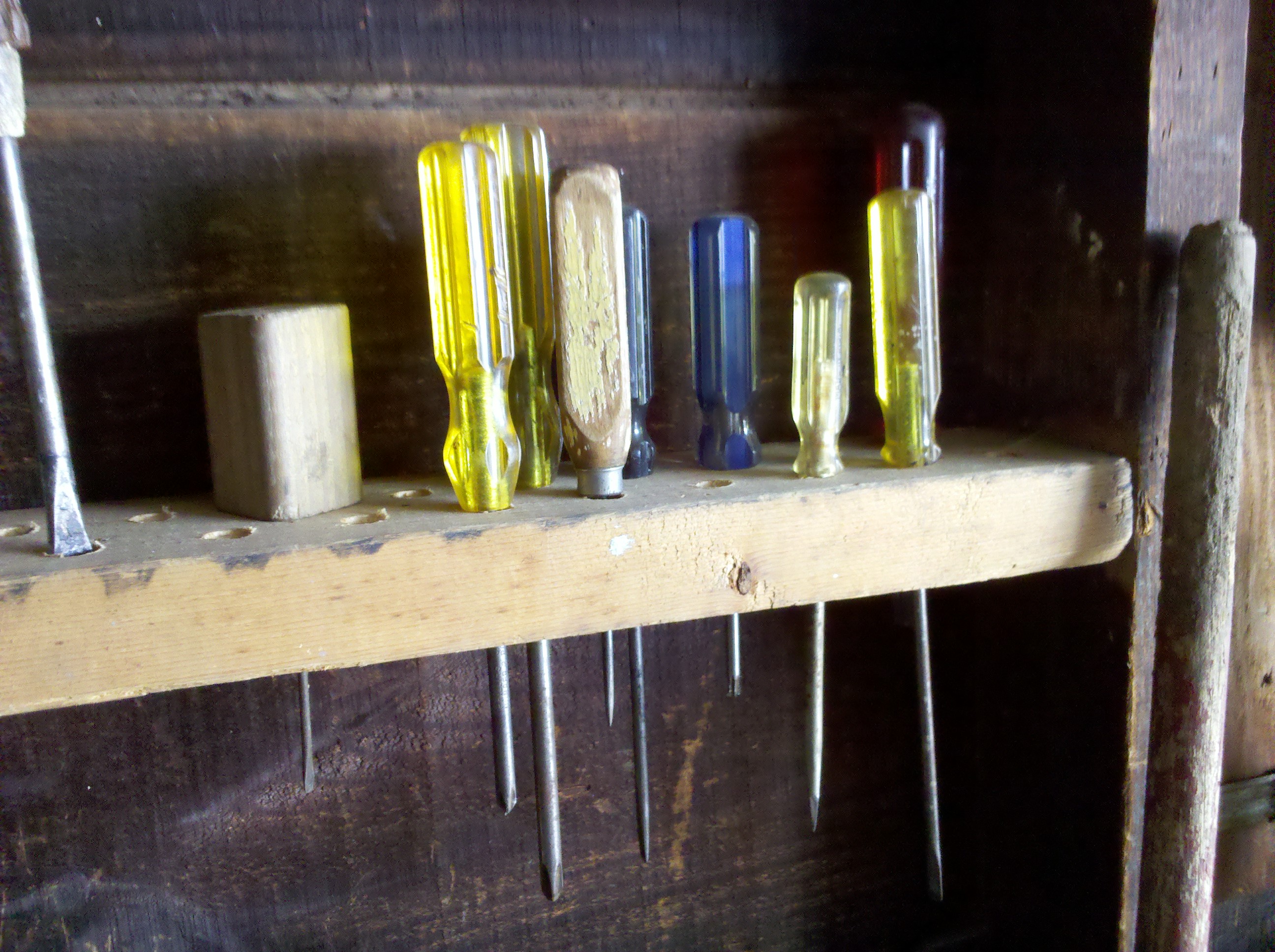 Here’s a set of screwdrivers sitting in manually-drilled holes in a 2x4. Thrifty! Sorry for the blur: