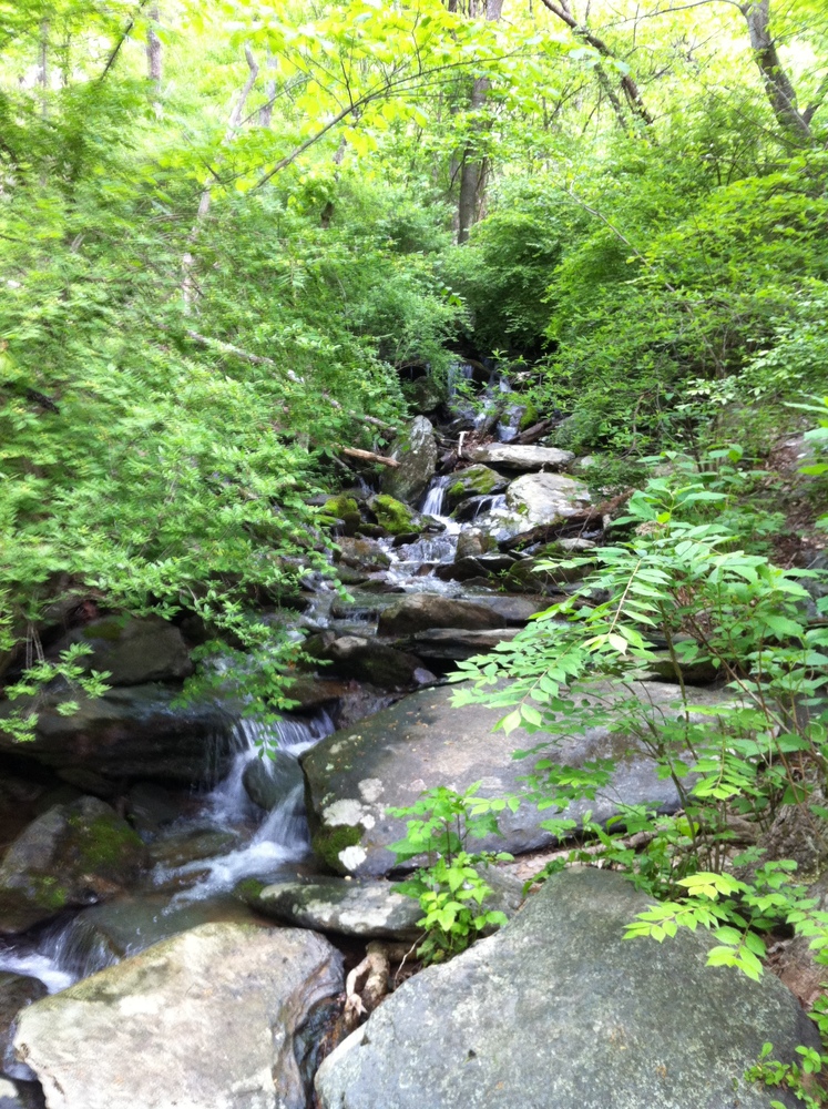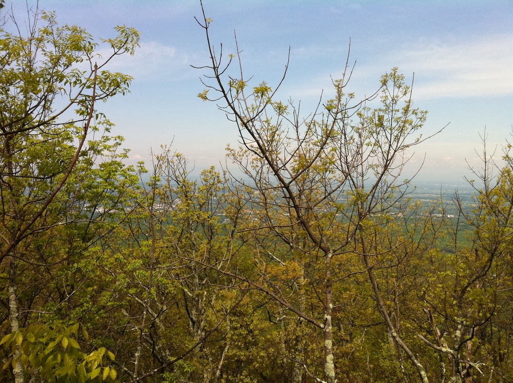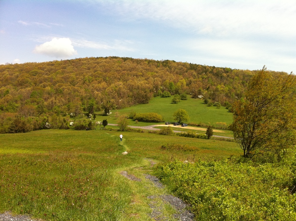 We went so blazingly fast along the trail we had walked seven miles before we even broke a sweat! The weather was perfect with a gentle breeze and a temperature in the mid 50s. For our speed and effort level it balanced out nicely. Given that we hadn’t had any breakfast thus far, we stopped on the side of the road at Rockfish Gap and the entrance to Shenandoah National Park. We sat and ate some breakfast and watched the cars go by on I-64 below. Behind us the Inn at Afton loomed large, reminding us of our stay there a few years back.