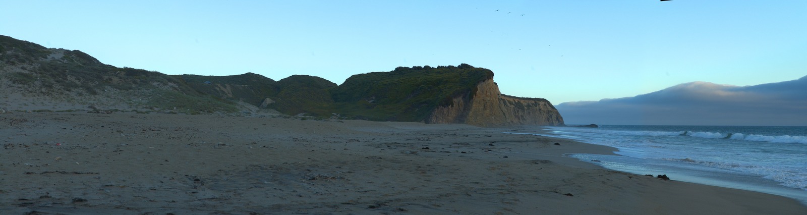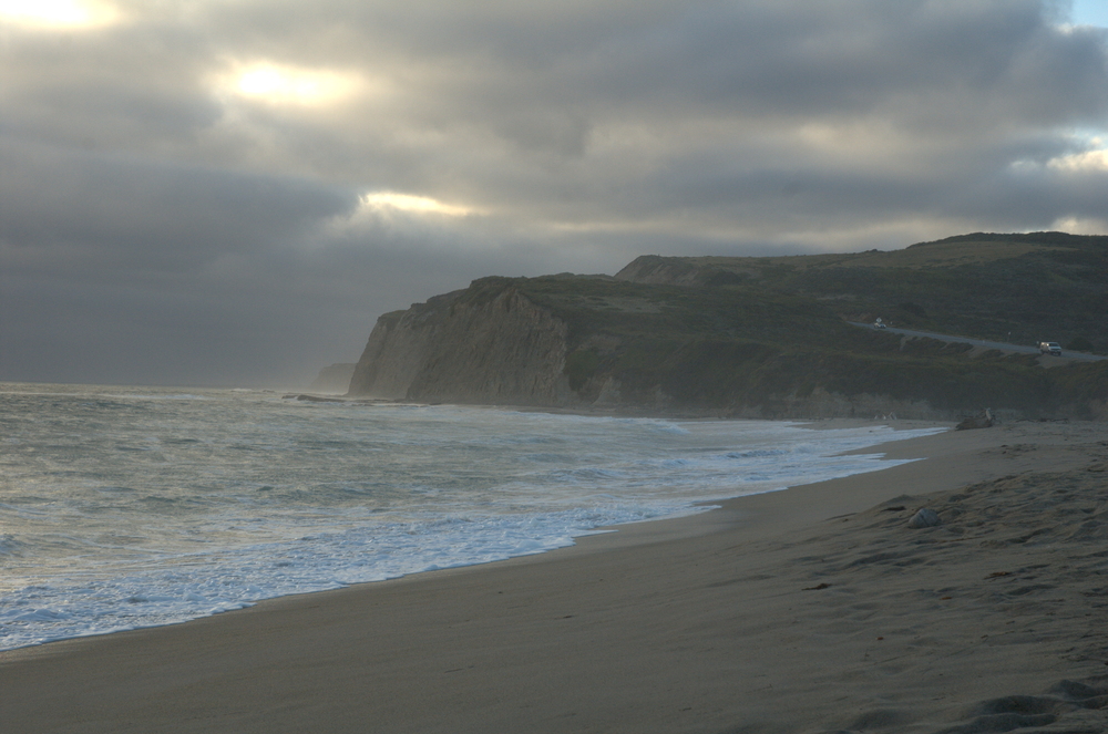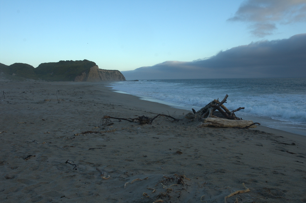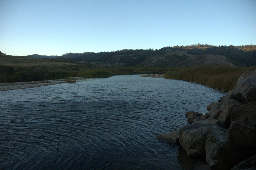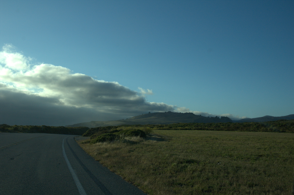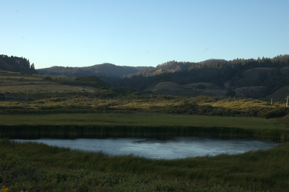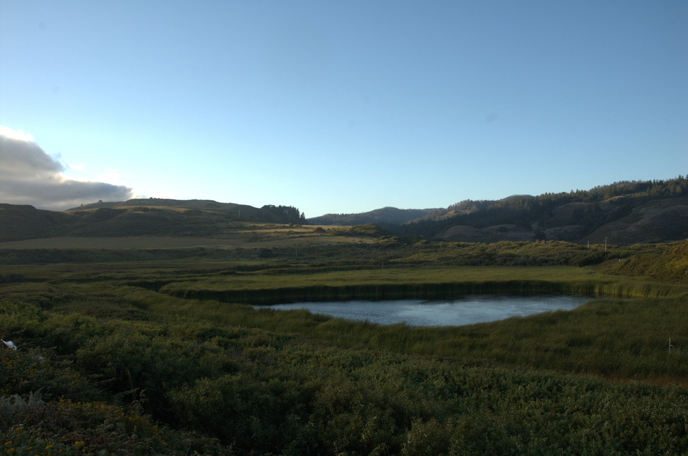 We decided to stop at a place we’d passed by on the way down to watch the sun go down. It was a good choice: on one side we had a green vista with a little lake of water, and on the other we had the Pacific and some steep bluffs. Here is the view looking inland: