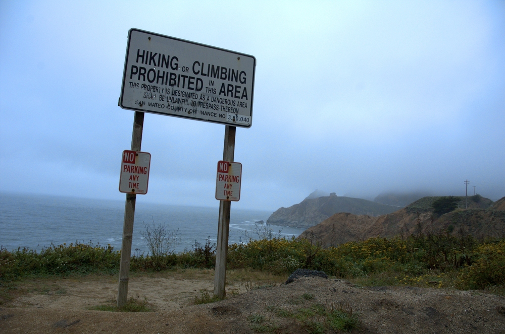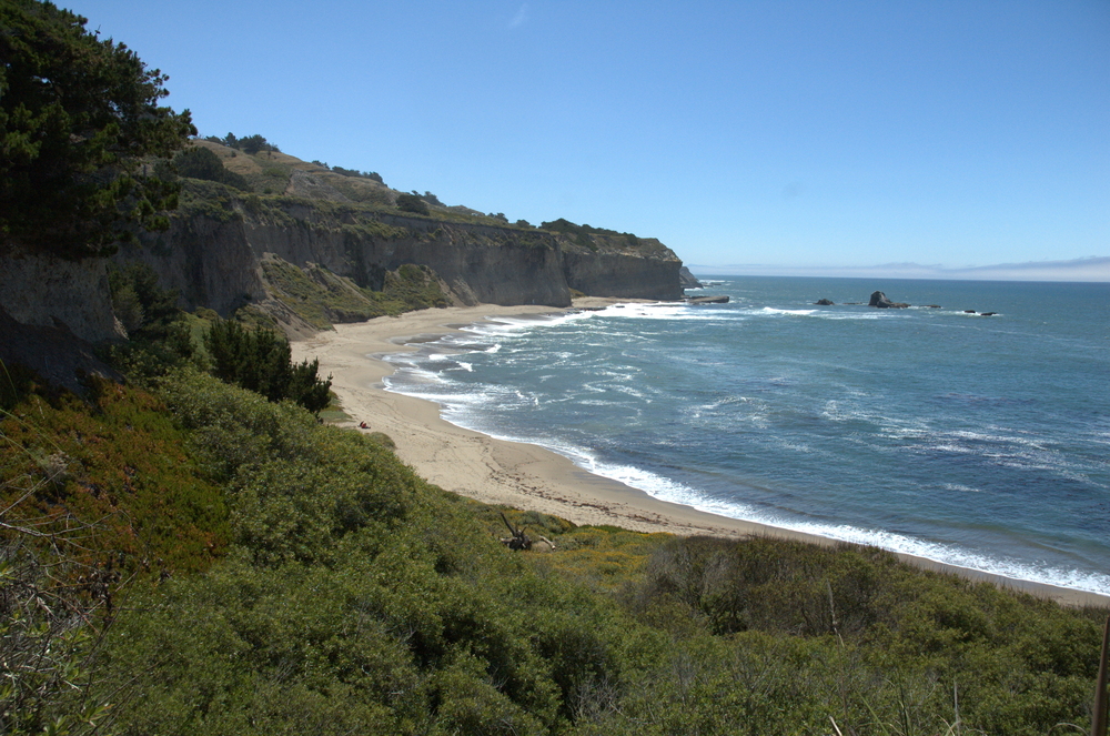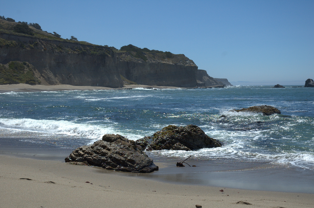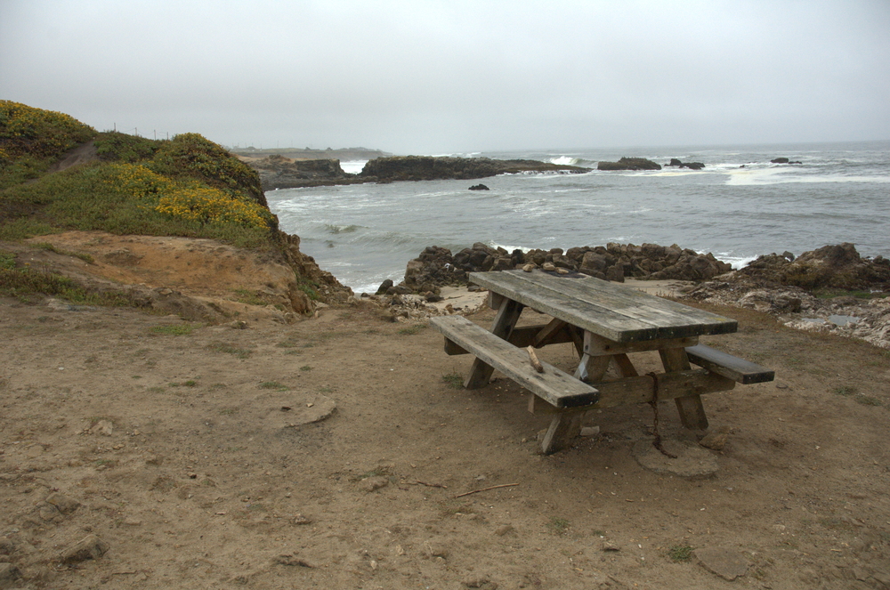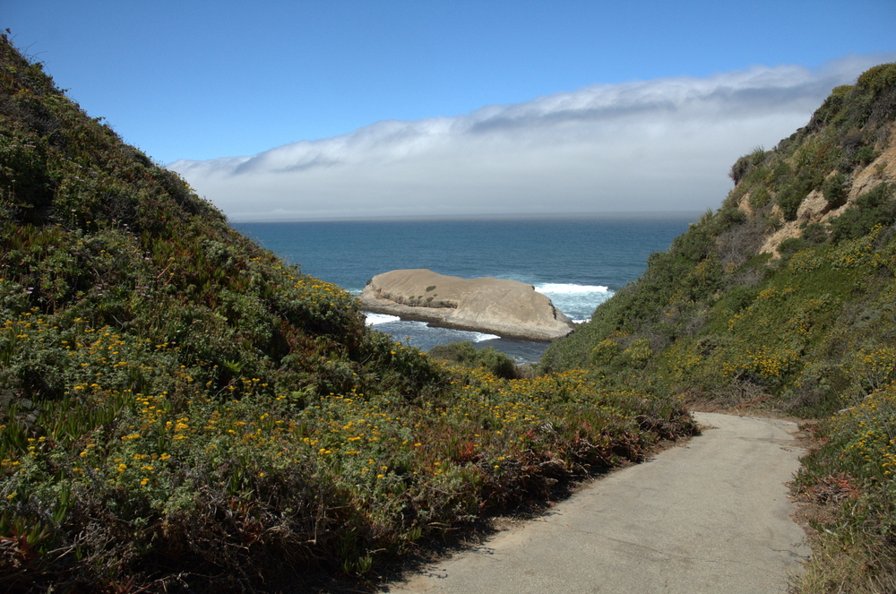 After staring in amazement for about a half hour we continued down the highway towards Santa Cruz, where we wanted to grab some lunch. Halfway there the fog cleared and we were left with a brilliantly clear sky. We pulled off a Greyhound Rock to see what sights it had to offer. We were greeted with a great view of the ocean from the parking lot.