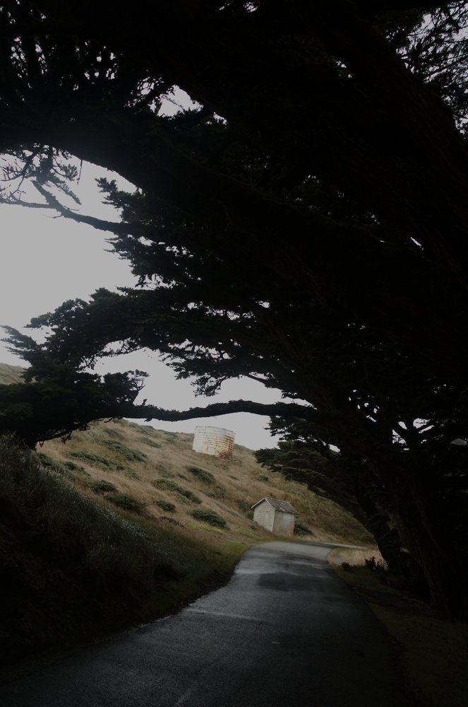 After a little bit of hiking we came to a point in the penninsula where the lighthouse was located. The wind picked up considerably and the mist was strong. Cypress trees were bent from the wind, forming a canopy.