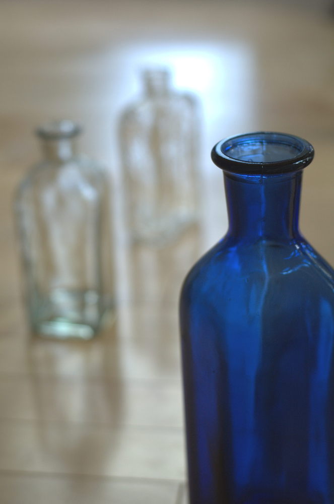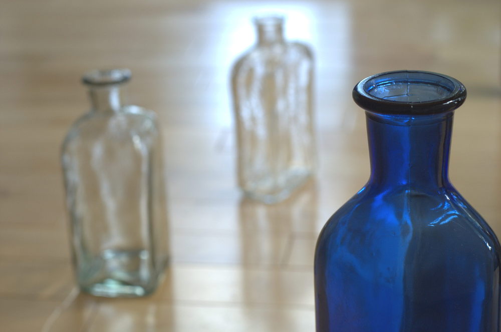 I got these three bottles from Goodwill for a couple of bucks, and I think they are just beautiful. While sticking to the same general shape, I varied up the color and size on just one in order to make it the “centerpiece.” I used to have them sitting on top of an antique dresser in my den, but now I have them on top of my bookcase. I love the way they look when they catch the rays of the afternoon sun.