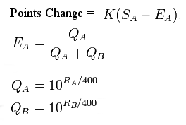 In the notation above E is the expected outcome, S is the actual outcome (1 for a win, 0 for a loss), and K is the experience adjustment factor. We’ll talk more about K in a minute, but for now just think of it as a constant.
