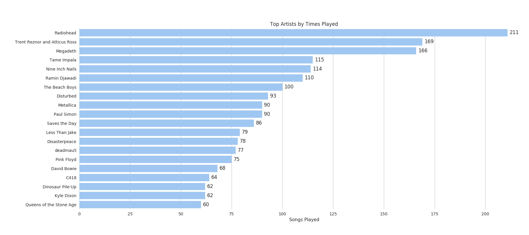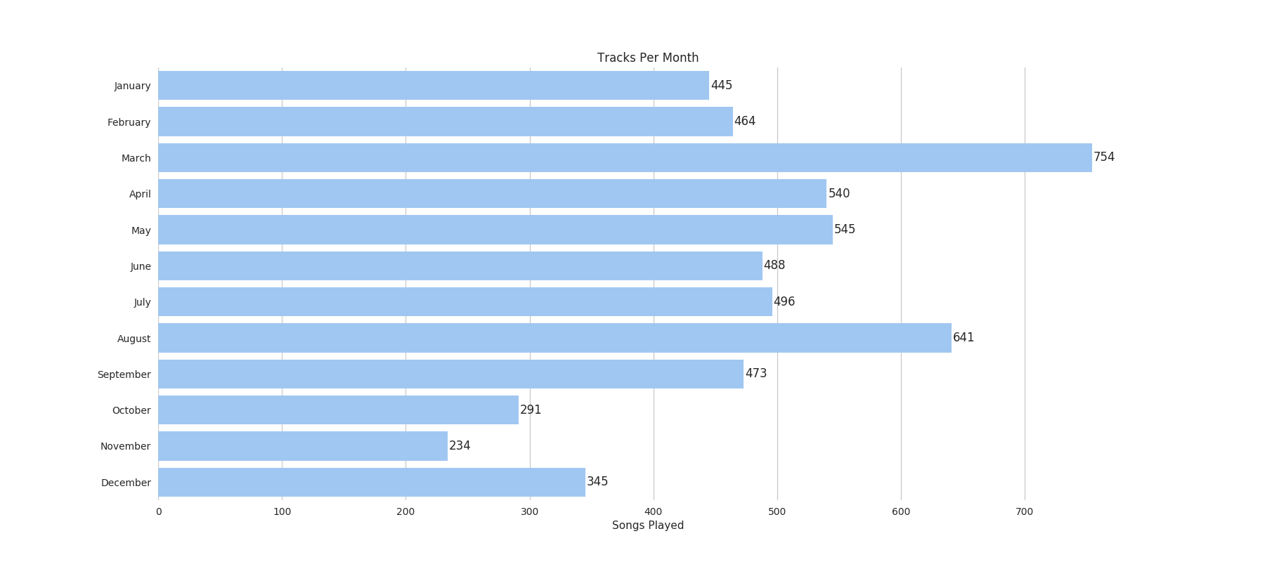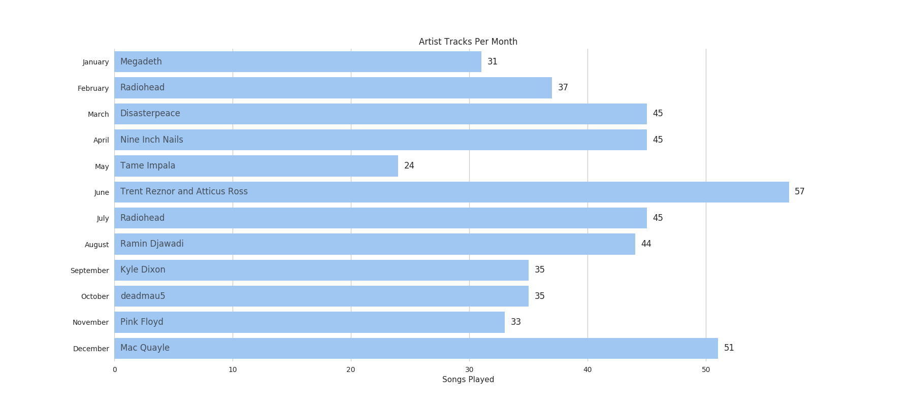 I like to look at this one just to get a gauge on whether or not I’m falling into any ruts. With the kids manning the Amazon Echo, that isn’t very likely these days and the numbers show it. I am a little surprised that December is lower than usual. I probably forgot to hook up Soma.FM to scrobble during that time. Usually the family rocks the Christmas themed channels pretty hard throughout the month.